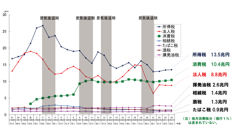 また、ここ10年くらいで見ると、所得税や法人税の税収は不景気のときに減少していますが、消費税は毎年10兆円程度(注)の税収が続いており、税収が経済動向に左右されにくく安定した税と言えます。