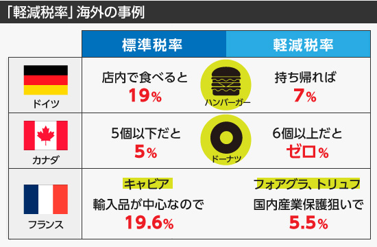 ドイツではハンバーガーを店内で食べると「ぜいたくな外食」として原則の税率(19%)で持ち帰ると必需品とみなして7%の軽減税率。カナダのドーナツも5個以下は「楽しいおやつをその場で食べる」で原則の5%なのに6個以上だとゼロ。フランスは同じぜいたく品でも国内で作られ消費すれば国民が潤うから「必需だ!」とフォアグラやトリュフが軽減5.5%で輸入中心のキャビアは原則の19.6%です。